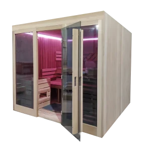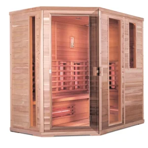 Infraroodsauna: verwarmt het lichaam direct via straling, lagere luchttemperatuur, milder voor mensen die warmte gevoeliger ervaren.